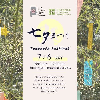 Join in for the Tanabata Festival, Japan's Star Festival! Experience the Japanese tradition of making wishes on colorful Tanzaku and hanging them on bamboo trees. Engage in a variety of cultural activities, such as origami, calligraphy, and Japanese yo-yo fishing. Explore the Alabama Bonsai Society's bonsai exhibition and enjoy a dance performance by Kids Japanese Dance from Huntsville! Refresh yourself with complimentary lemonade provided by Starbucks. This free, family-friendly event promises something special for everyone to enjoy!