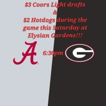 Need your football fix? Head to beautiful Elysian Gardens to watch Alabama take on Georgia in what is sure to be an exciting game! There will be $2 hotdogs and $3 beers during the game. Bring your friends and enjoy this unique Birmingham venue right in the heart of Avondale!