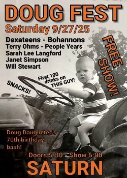 Saturn is hosting a Bday event for Doug! Come enjoy a FREE show and snacks! The line-up is pretty impressive, too! Dexateens / Bohannons / Terry Ohms / People Years / Sarah Lee Langford / Janet Simpson / Will Stewart!