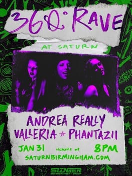 Andrea Really's 360° Rave is BACK! Hear a huge range of underground EDM genres in full surround sound on a dance floor in-the-round! Enjoy an immersive sound experience from Murda One Soundsystem and Saturn's L-Acoustics rig. There will be a DJ booth in the middle of the dance floor! Live visuals by MK Gartner! Don’t miss this ALL femme lineup with music by Birmingham's own Andrea Really, Valleria (Nashville), and Phantazii (Huntsville)!