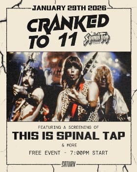 In celebration of Rob Reiner and one of the greatest music films ever made, Saturn presents This Is Spinal Tap, the movie where art copied life, life copied art back, and every band on the road has been quoting it ever since. Not only is it the ultimate rock mockumentary, it is simply one of the best comedy films of all time. Saturn will screen the film, then keep the night going with a Spinal Tap costume contest, an air band contest, raffles, and a few surprises! Costumes encouraged. Participation encouraged. Everything will be cranked up to 11. Because, of course, that is One Louder!