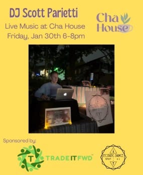 Sign up for Trade it Forward or purchase Ecstatic Dance Bham's ALL ACCESS 2026 pass while listening to Scott Parietti on the decks at Cha House! Enjoy some chill beats as you sip on custom blends of tea. This is a relaxing way to spend the first part of your Friday night.