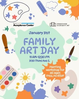 Join in at MCAC with your family (chosen or otherwise) and friends for a FREE paint class in partnership with the Birmingham Museum of Art on Saturday, January 31st, from 11:00 AM to 12:30 PM. No registration required, just come create a fridge worthy masterpiece!