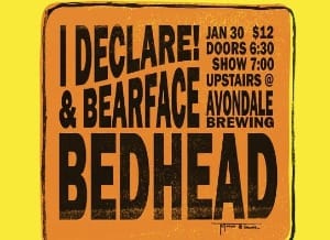 Come and hear some fantastic music at the Upstairs at Avondale this Friday night! Avondale Brewing will be hosting Bedhead with special guests Bearface and I Declare! This will be a great evening of music and is a great way to stay warm while having fun! Grab your friends and head on over!
