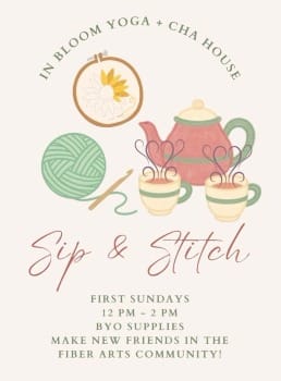 Join Hayley Holdridge of In Bloom Yoga for a free Sip + Stitch workshop on the first Sunday of each month from 12-2 pm! This month, they’ll be joined by the sounds of gentle jazz from local musicians and Cierra and the Cha House team will be serving tea! Intermediate skill level encouraged for those looking to learn crochet patterns from Hayley, but all fiber arts and skill levels are welcome to gather and enjoy a cozy Sunday of tea and jazz! Bring your crochet hooks, knitting needles, embroidery hoops, or any other art skill you’d like to work on!