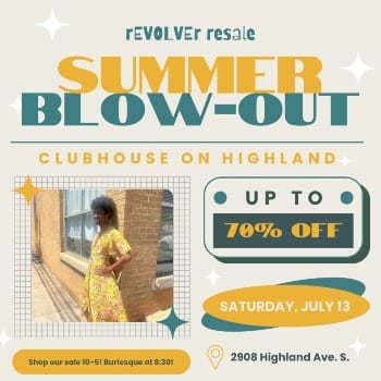 Don’t miss the Summer Blowout Sale + burlesque show & concert at Clubhouse on Highland! Shop some major deals on clothing from 10 a.m.–5 p.m. (up to 70% off select items!) followed by live music from Great Jane and a fun and fabulous burlesque show (21+) hosted by Femmie Moore and friends! Clothing sale is free and open to the public; burlesque show doors & live music at 7:30, show at 8:30, suggested donation $20 (pay what you can). Please bring cash to tip performers if you are able! Cocktails and mocktails by the talented DeAngelos Daiquiris for a suggested donation! Music by Great Jane (7:30-8:30) followed by DJ YANA!