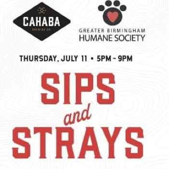 Join in this Thursday from 5-9pm for a special giveback evening at Sips & Strays. Enjoy cold beer and specialty cocktails and grab dinner from The Current on the patio! There will be live music from Moral Support from 6-8pm. Be sure to enter your pet to be the ‘poster pet’ for next year’s takeover! Cahaba Brewing will be donating 10% of all beer sales to the Greater Birmingham Humane Society all day!