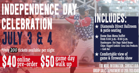 The Birmingham Barons will have Saturday night Fireworks as they take on the Chattanooga Lookouts! After the game on Sunday, stay to watch Thunder on the Mountain from the stadium! For $40 you can get access to the ballroom and a hotdog and burger bar! The ticket also allows you to watch the fireworks from the upper deck seating! Two nights packed with patriotic fun!