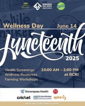 In partnership with UAB Live HealthSmart & Jones Valley Teaching Farm, kick off your Juneteenth celebrations by prioritizing your well-being. Stop by BCRI for free health screenings and wellness resources. Local farmers will lead hands-on workshops centered on seed planting, food justice, and small farming. Discover how caring for your health is a form of liberation. TO REGISTER FOR A SCREENING: Call (205) 996-2304 and leave a voicemail with your first name, last name, phone number, and the desired date and time for your appointment.
