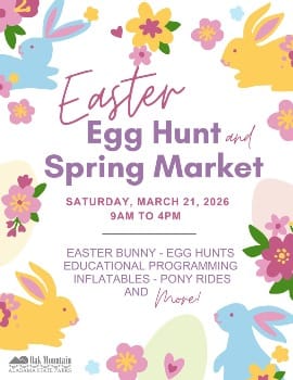 Bring your basket and be ready to have fun! This year's Easter Egg Hunt will be located off Terrace Drive in the Multi-use Field by the Discover Shelby Pavilion! Oak Mountain will be celebrating and having a Hopping Good Time from 9am until 4pm on Saturday, March 21st! Everyone is Welcome! Egg Hunts will be hosted for children Ages 0-10 (various times for each age group.) You can also enjoy educational activities, crafts, pony rides, inflatables, food trucks, music, and photos with the Easter Bunny!