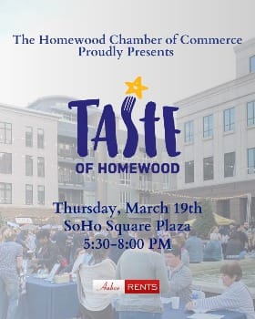 Head to SoHo Square Plaza for an evening celebrating the incredible flavors that make the Homewood community so special! Tickets are available now and include unlimited food and beverage samples, live entertainment, and more from over 25 local restaurants. ($35 ahead of the event / $40 at the door) This is a delicious way to discover and support some incredible local restaurants!