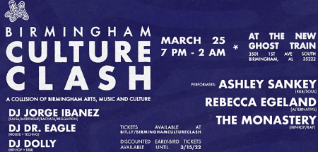 Birmingham Culture Clash is a pop-up cultural discovery experience rooted in Birmingham, Alabama.For the March installment of Birmingham Culture Clash, DJ Dr. Eagle is showing up with a set of House and Techno tunes, while DJ Jorge Ibanez serves up a fine mix of salsa, merengue and reggaeton vibes, and DJ Dolly immerses you into the modern world of R&B and Hip-Hop. In between each hour-long DJ set there will be performances by alternative singer/song-writer Rebecca Egeland R&B/Soul singer Ashley Sankey and rap duo, The Monastery. Various food truck options will also be accessible during the event.