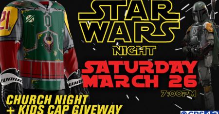 The Bulls take on the Knoxville Ice Bears this Saturday! Enjoy a $5 Discount per person for groups of 10 or more! It’s also church night, Star Wars Jersey Night, and the first 1000 kids Ages 14 & under receive a Bulls cap! There will be a Specialty Jersey Auction after the game!