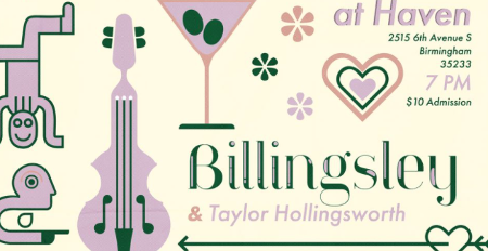 Join in for a night of great music from Billingsley & Taylor Hollingsworth! Drift Kitchen will be on site serving up some delicious food! There will also be a full bar and a pop up print shop by Yellow Hammer Creative! Don't miss this fun event at one of Bham's coolest venues!