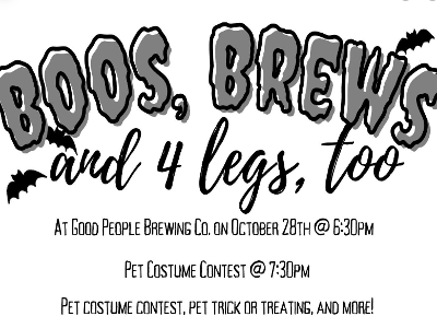 The Best Friends of Shelby Humane are excited to host Boos, Brews, and 4 Legs, Too! at Good People Brewing Co. Friday, October 28th. Trick-or-Treating begins at 6:30pm. Receive a Best Friends canvas tote bag filled with swag. Stop by the Patton Chapel Animal Clinic and Hollywood Feed (Lee Branch) tables for fun goodies! Pet Costume Contest begins at 7:30pm $10 Entry fee - sign up as early as 6:30pm. 4 lucky winners will win a prize basket valued at over $200 Come for the BOOS, stay for the BREWS!!