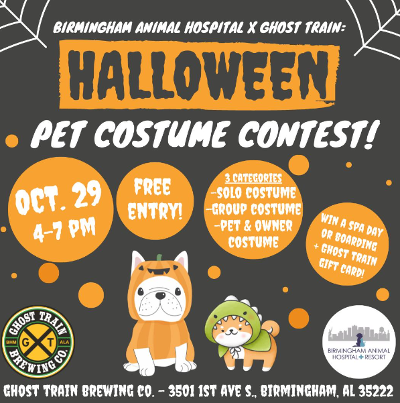BRING YOUR PETS IN THEIR HALLOWEEN BEST! Ghost Train is partnering with Birmingham Animal Hospital + Resort for the Pet Costume Contest! Enter for free to win! 3 Categories: 1. Best Group Costumes 2. Best Solo Costume 3. Best Pet & Owner Costume! 3 First Place Winners will receive their choice of a day of daycare, a bath, or a night of boarding + $50 Ghost Train gift card. Free Entry!