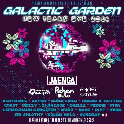 This is sure to be one of the premier EDM events in the Southeast to ring in 2025: THE GALACTIC GARDEN ! Get ready for a CRAZY lineup of bass music talent from all over the country, headlined by one of the biggest up and coming names in EDM, Jaenga, who’s been selling out venues all over the map. Whether you like bass music, house music, funk, live instruments, or hip hop, this show has something for everyone. This party goes until 3am, so it's perfect for those who want to stay out late and dance into 2025!