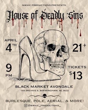 Get ready for a night of fun at the House of Deadly Sins at Black Market Bar Avondale- it's gonna be wild! The night will feature burlesque and pole routines as well as some cool aerial performances! These events always make for a fun couples date night. You can stop in early to get some dinner from Black Market Bar before the show starts!