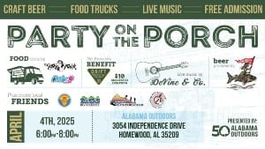 Party on the Porch brings together local musicians, breweries, food trucks, and local businesses for an evening you do not want to miss! This is a family-friendly event, with activities for kids, a dog-friendly atmosphere, live music, good food, cornhole, giveaways, and loads of fun! Attendance is free, but they ask that of-age (21+) attendees donate (not required) $10 for a wristband and a souvenir cup with your donation going to a local non-profit organization at the event. They’re kicking the 2025 season off strong and are celebrating 50 years of Alabama Outdoors! Enjoy live music from DeVine & Co., tasty bites from The Tako Truck and Cookie Plug, and cold Alabama Light from Alabama Beer Co.!