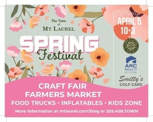 The 2025 Mt Laurel Spring Festival is set for Saturday April 5th from 10 a.m. until 3 p.m. Celebrate the best spring has to offer in the beautiful Town of Mt Laurel where guests have the opportunity to shop our vibrant street fair, savor dishes from the best local area restaurants and food trucks, and enjoy a day strolling the idyllic streets of one of Birmingham’s best neighborhoods. The Mt Laurel Spring Festival has continually grown to be a premier family event. Visitors will enjoy shopping at the many artisan and farmer pop-up booths; listening to live music performed on the Bryson Square Stage; and savoring delicious eats at Mt Laurel restaurants and Birmingham food trucks.