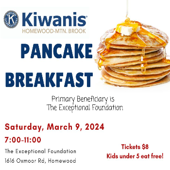 It’s time for the annual Kiwanis Club of Homewood’s pancake breakfast! Get a plate full of pancakes for just $8. Proceeds benefit the Exceptional Foundation. This event has become a family favorite! There will also be kids activities on site during the event.