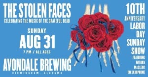 The Stolen Faces 10th Anniversary Labor Day Sunday show will be at Avondale Brewing featuring Nathan McCleod on saxophone! This Grateful Dead tribute band has been going for 10yrs strong! Come and help them celebrate this Sunday night! Wear your tie dye and get ready for a great time. They’ll be playing the greatest hits for you to enjoy!