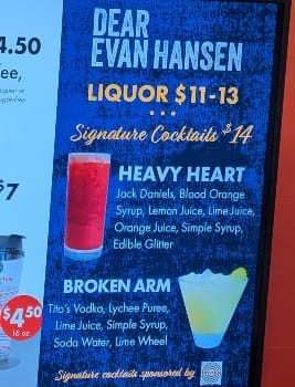 Red Mountain Theatre has done a few really great things for this production. They have two specialty cocktails in honor of the show. A “Broken Arm” and a “Heavy Heart,” both of which are light and citrusy.