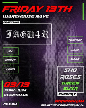 NuSaga Entertainment presents the Friday the 13th Rave at the spooky Conjure Haunted Attraction! Get ready for a night full of great beats in a unique venue. The event will feature JAGU4R, Roses, and local favorite DJ Sho! This event is perfect for those looking for a little late night fun!