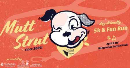 Mutt Strut is fun fur all! Hand in Paw is excited to announce that the 12th Annual Mutt Strut: Dog-Friendly 5k and 1 Mile Fun Run will take place at Homewood Central Park on April 23rd! Grab your furry friend and join Hand in Paw for a fun day full of exciting race routes, contests and more - all while supporting a great cause! Mutt Strut Vendor Village will be open from 8:00AM-12:00PM and you can enjoy live music as well as some delicious food trucks! Check the link for all the categories you can place in!