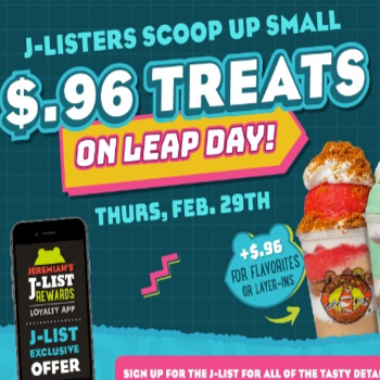 Join Jeremiah’s Italian Ice on Leap Day as theyLEAP BACK in time with $.96 Small Treats all day long for J-List Rewards members! They’re celebrating the history of Jeremiah’s tasty treats with an EPIC Block Party that can’t be missed. J-List App users will enjoy small Ices or Gelatis for just $0.96 each, with $.96 upgrades to Flavorites and Layer-Ins! PLUS, when you use the J-List App on Leap Day, you’ll be entered to win a cool throwback prize pack OR win a VIP ‘Sweet’-stakes Getaway where you and a guest will leap to Orlando and get a behind-the-scenes peek into the world of Jeremiah’s Ice!