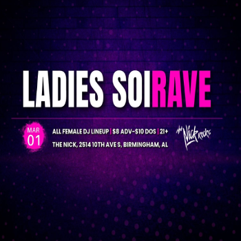 Ladies SoiRave is coming to The Nick! Join in for an exclusive all-female, multi-genre EDM experience featuring performances by local and regional talent at one of Birmingham's oldest nightclubs. LGBTQIA+ friendly PLUR event. This is such a fun way to kick off Women’s History Month!