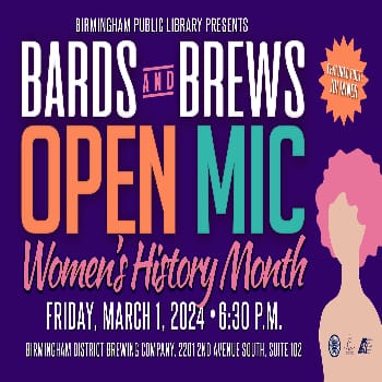 Grab a beer from Birmingham District Brewing Company & take a seat to hear some of the Birmingham metro area's most talented poets reflect on women’s history & womanhood for this Women’s History Month themed open mic. Bards & Brews March Open Mic is hosted by local poet Thed Weller at the Birmingham District Brewing Company & our featured poet is Joi Miner. Bards & Brews happens on the 1st Friday of each month & promises a night of spoken word poetry paired with something to sip on. Everyone is welcome to perform at this open mic with their preferred form of spoken word art or just join as a part of the crowd to support Birmingham’s artists.