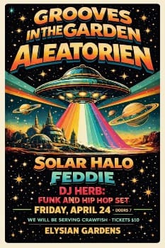 Don’t miss this night full of music and beats at Elysian Gardens! This is such a great venue and the DJs will be fantastic! You’ll hear music from: Aleatorien, Solar Halo, Feddie, and DJ Herb! It’s going to be an amazing night!