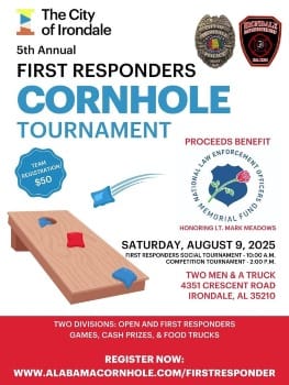 Join in for the 5th Annual First Responders Cornhole Tournament, hosted by The City of Irondale, benefiting the National Law Enforcement Officers Memorial Fund and honoring Lt. Mark Meadow. There will be two divisions: Open and First Responders. Enjoy a full day of games, cash prizes, and food trucks. The event is indoors, so you can have fun and beat the heat!