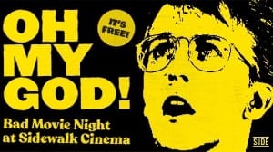 The GOOD news is the movie is FREE! The bad news? It’s a BAD movie. Head to Sidewalk Cinema with your friends to laugh and jeer whatever bad movie ends up on the screen? Will it be Battlefield Earth? Will it be CATS? What we CAN tell you is that it’s going to be a fun time! Arrive early and hit up the concession stand for food, snacks, cocktails, mocktails, and more! You can also get some Sidewalk merch before the upcoming Sidewalk Film Festival later this month!