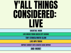 Head to Saturn for a one-of-a-kind variety show celebrating Southern voices, creativity and community. Inspired by the spirit of NPR and powered by local talent, Y’All Things Considered live from Saturn brings together storytellers, musicians, poets, trivia, improv and more for a night that’s thoughtful, fun and full of heart. Come enjoy a cash bar, food truck, entertainment and exciting door prizes!
