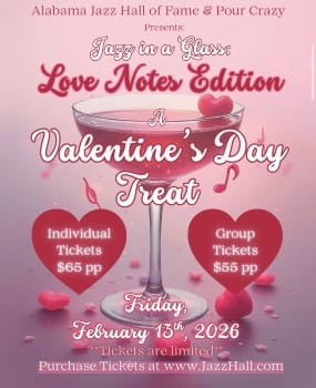 Grab your girls or plan a perfect date night! Jazz in a Glass is back at the historic Carver Theatre! The Alabama Jazz Hall of Fame, in partnership with Pour Crazy, invites you to Jazz in a Glass: Love Notes Edition, an immersive cocktail-making experience where mixology meets the magic of jazz. Jazz in a Glass is an interactive cocktail class that blends craft, creativity, and culture. Led by a professional mixologist, guests will create three signature cocktails inspired by the bold, smooth character of jazz icons. Whether you’re a cocktail lover, a jazz fan, or just looking for a unique night out, this experience delivers an unforgettable mix of flavor, music, and fun—perfect for couples, friends, or solo guests.
