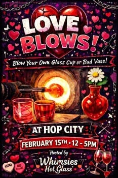 Come Celebrate Love or the lack of it with Whimsies Glass Blowing at Hop City! Blow your own glass while enjoying a huge selection of beers on draft or shopping for your after Valentine's date Wine bottle. This process is mesmerizing to watch!