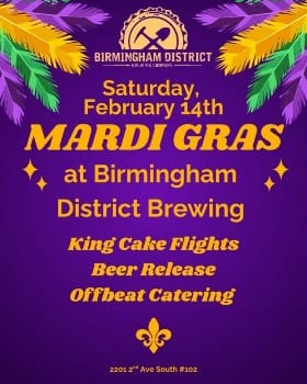 Celebrate Mardi Gras at Bham District Brewing! Sip on a new beer release! Dine on some Louisiana eats by Off Beat Catering. Be sure to arrive early and enjoy some King Cake Flights w/ authentic New Orleans king cake from Gambino's Bakery while supplies last! Laissez les bons temps rouler!
