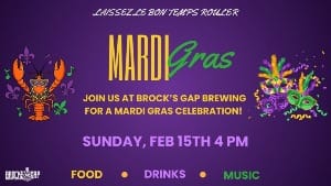 MARDI GRAS PARTY at Brock’s Gap Brewing Company! Let the good times roll! Brock’s Gap is bringing the Mardi Gras vibes with live music, great food, and festive drink specials flowing all evening. Throw on your beads, grab your crew, and come celebrate in BGBC style! It’s going to be a great party!
