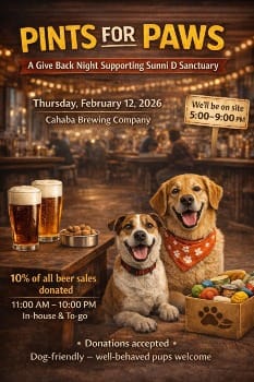 Join in for Pints for Paws, a Give Back Night benefiting Sunni D Sanctuary! On February 12, 10% of all beer sales (in-house & to-go) at Cahaba Brewing Company from 11:00 AM to 10:00 PM will be donated to support rescue dogs in our community. Meet the Sunni D team, take photos, AND enjoy Luna and Willow as they show off their aerial moves using silks!
