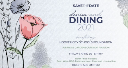 Denim and Dining is back in-person at the Pavilion at Aldridge Gardens this year! The event will feature live and silent auctions, entertainment, a catered barbecue dinner from Jim 'n Nick's, drinks and a coffee bar. Tickets are limited, so buy yours today! The price is all inclusive and benefits Hoover City Schools!