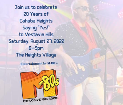 The Cahaba Heights Merchants, City of Vestavia Hills and the Vestavia Hills Chamber of Commerce have joined together to celebrate 20 Years of Cahaba Heights Saying "Yes" to annexation into Vestavia Hills! Get your dancing shoes ready and come celebrate in the Heights Village in Cahaba Heights! There will be awesome music by the M-80s, a variety of vendors and food and beverages available from Heights Village restaurants. Be sure to mark your calendar for this fun night of celebration!