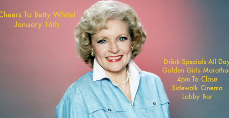 Get over to the Sidewalk lobby bar to celebrate Betty White on the eve of what would have been her 100th birthday! They will have GOLDEN GIRLS-themed drink specials all day and a GOLDEN GIRLS marathon on all screens in the bar/lobby from 4pm to close. Come celebrate the life of this American treasure!