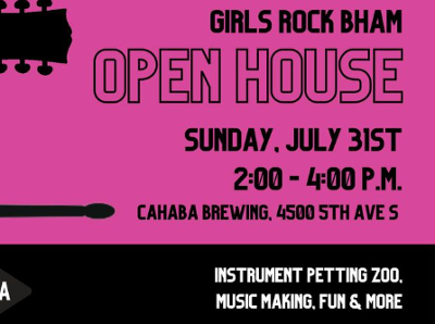 Join Girls Rock Bham for an awesome Open House on Sunday, July 31st from 2:00 - 4:00 p.m. at Cahaba Brewing Company. Friends of all ages can try out various instruments, write a song, participate in a jam session, make art, and more. Girls Rock looks forward to rocking with YOU!