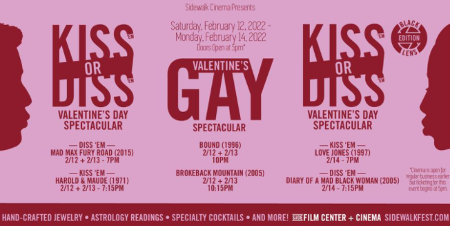 Sidewalk returns with its legendary Kiss ‘Em or Diss ‘Em Valentine’s Spectacular! Kick things off with EITHER a Diss ‘Em title at 7:00 pm -OR- a Kiss ‘Em title at 7:15 pm! The lobby will be decked out for Valentine’s! Tickets are $30 per person and include one ticket to the film of your choice, one drink ticket redeemable for a glass of Korbel Champagne (if you’re 21+, a large soda of choice if not), one small popcorn, and a super special sidewalk surprise! Give some love to your local independent cinema this Valentine’s Weekend!